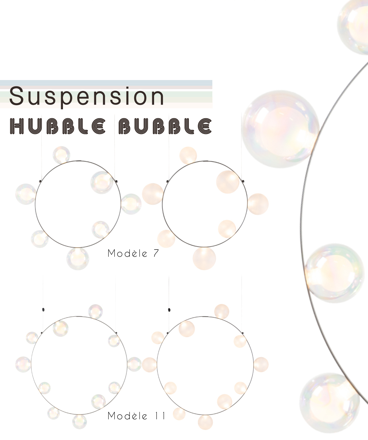 | Hubble Bubble, conçue par le studio Marcel Wanders, est une lampe à suspension aérienne et joyeuse. Disponible en deux tailles, avec 7 ou 11 bulles LED en verre en versions huile-irisées ou givrées. Hubble Bubble peut être suspendu à la fois horizontalement et verticalement et est alimenté par Electrosandwich® par Marcel Wanders. Hubble Bubble est la pièce de déclaration joyeuse de votre maison qui peut être suspendue sous n'importe quel angle. |