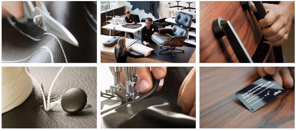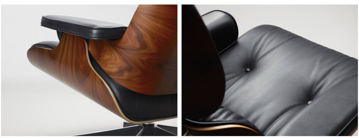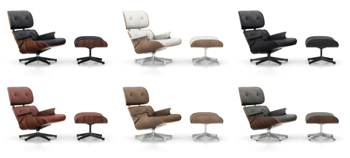 Vitra produit le Lounge Chair de Charles et Ray Eames depuis les années 1950 selon le procédé de fabrication d'origine. En concertation avec le Eames Office, Vitra a désormais élargi son offre en intégrant de nouvelles combinaisons de couleurs de cuir, de bois de placage et de piètements soigneusement coordonnées.