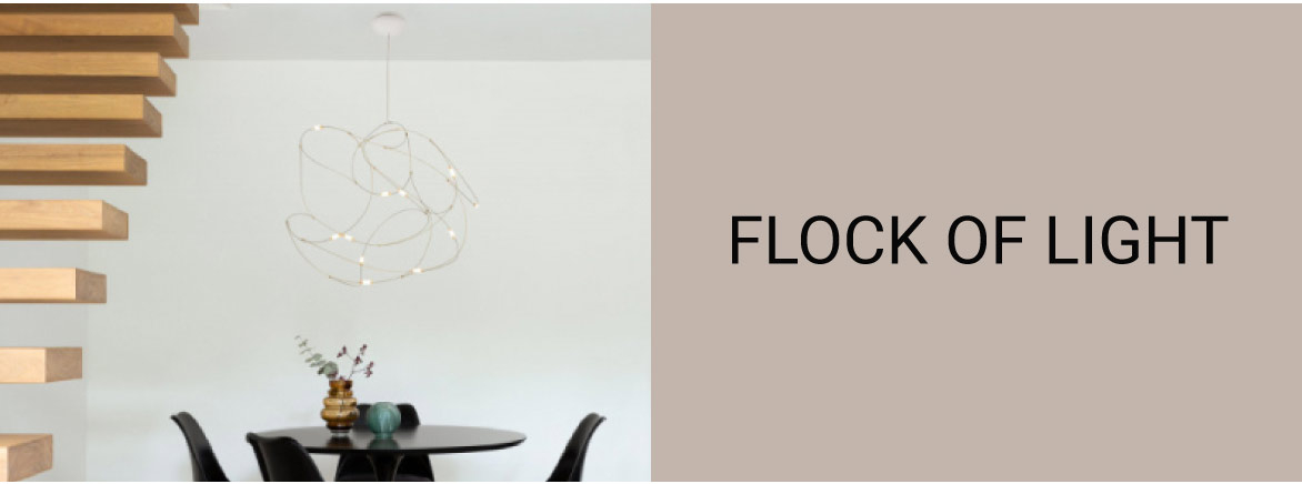 Flock of Light, de Studio Tour, se transforme d’une pièce de design artistiques légère et aérée le jour à un essaim de lumières vives la nuit. Flock of Light est disponible en deux tailles : 11 et 21, après le nombre de sources lumineuses. Les deux tailles sont fabriquées à partir de coupelles en laiton, de fils de bronze de diffuseurs en polycarbonate semi-transparent. Cette suspension apporte un éclat lumineux, chaleureux et poétique juste après la tombée de la nuit. Un flock of light capturé dans l’immobilité.