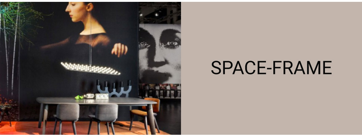 Space-Frame de Marcel Wanders partage la même liberté raffinée de ne pas être lié ou limité par des câbles et l'emmène un peu plus loin en affirmant l'indépendance complète. En effet, son cadre architectural fort, un grillage géométrique de fils de métal léger et des lumières transparentes, se bloque sur une charnière qui permet de changer de position dans l'espace.