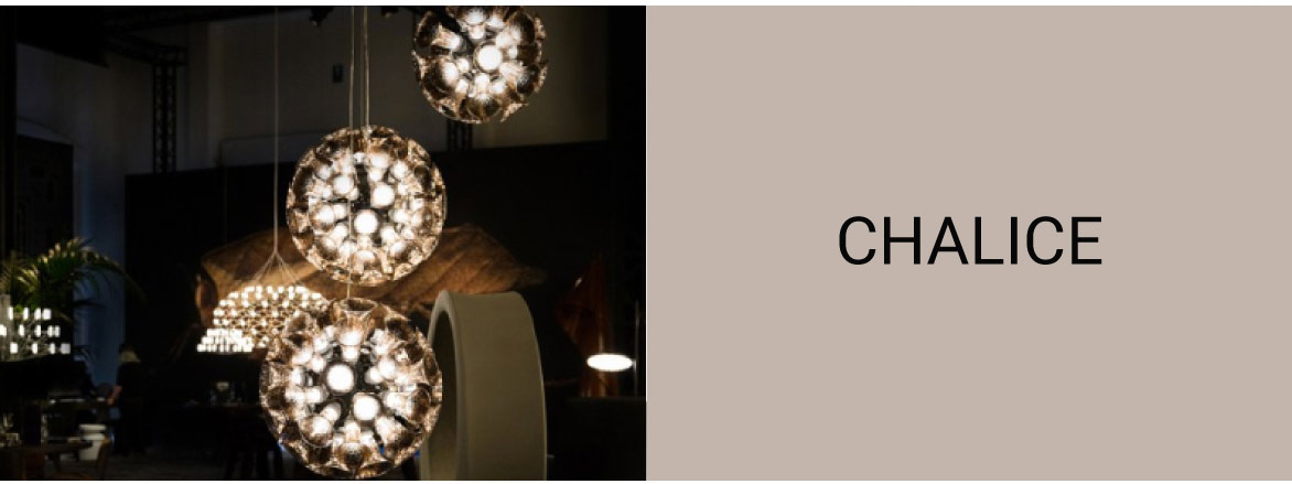 La suspension Chalice a été dessinée par Edward van Vliet en 2016. Essentiellement composée de verre, la suspension représente un bouquet de 24 ou 48 Fleurs. La lumière est diffusée de façon naturelle.