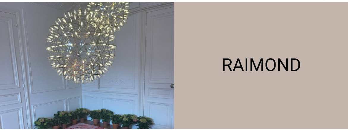 Raimond est une suspension design créée par Raimonds Puts avec OX-ID pour Moooi. Raimond miroite avec ses dimensions pouvant aller jusqu'à 2 mètres et contenant des centaines de lampes LED. Regarder les étoiles est maintenant possible même pendant les nuits couvertes. Les sphères complexes de Raimond transportent le courant électrique. Les terminaux joignent alors ces chemins pour créer une ambiance atmosphérique.