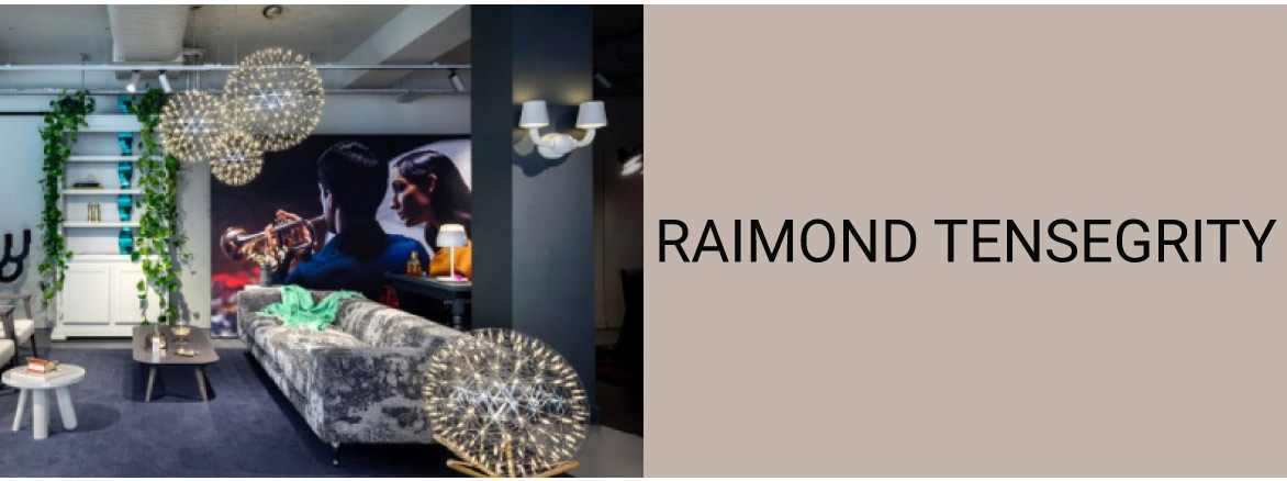 Inspiré par le principe de la «tenségrité» (intégrité tensionnelle, compression variable), Raimond Tensegrity incarne un équilibre parfait entre les forces de traction. Une sphère LED géante semble planer au-dessus de son socle en bois aérienne avec grâce éthérée. Ce luminaire était un rêve de son créateur, tenant dans un espace où les gens peuvent admirer cette merveille pétillante créant une ambiance atmosphérique.