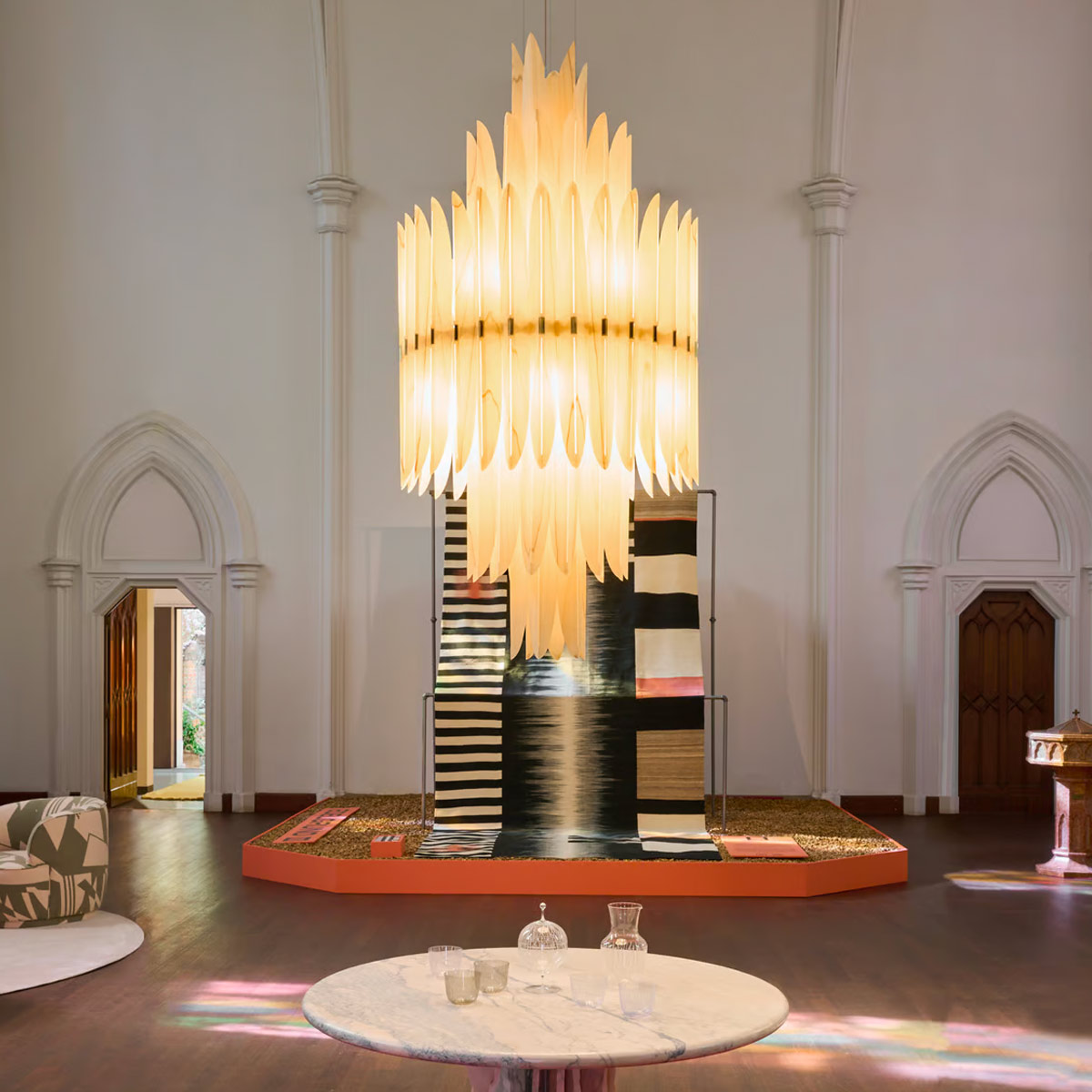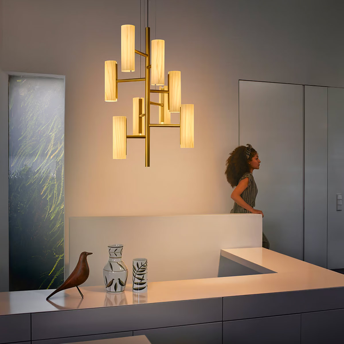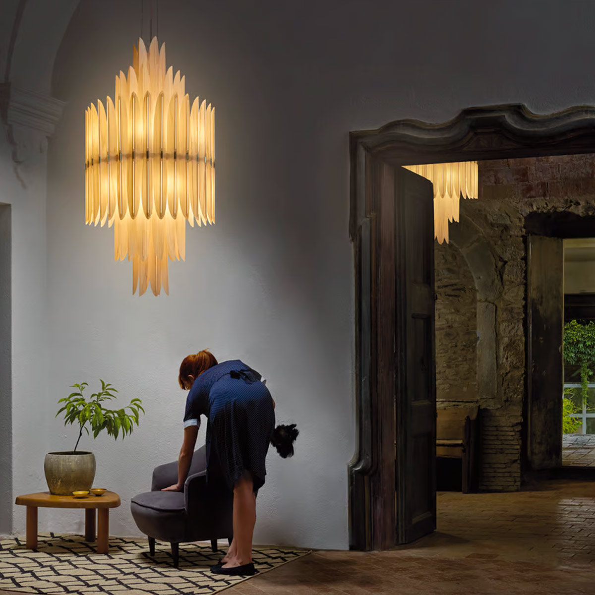 Volière est une réinterprétation contemporaine d'un lustre art déco classique des années 1920. Avec son clin d'œil à l'élégant design d'éclairage art déco français, les éléments en placage de bois aux couches complexes de Volière sont disposés à la manière de plumes. Composé par Bodo Sperlein, Volière met en valeur l'appréciation du designer pour l'artisanat et la matérialité.