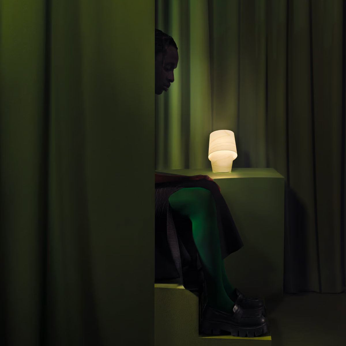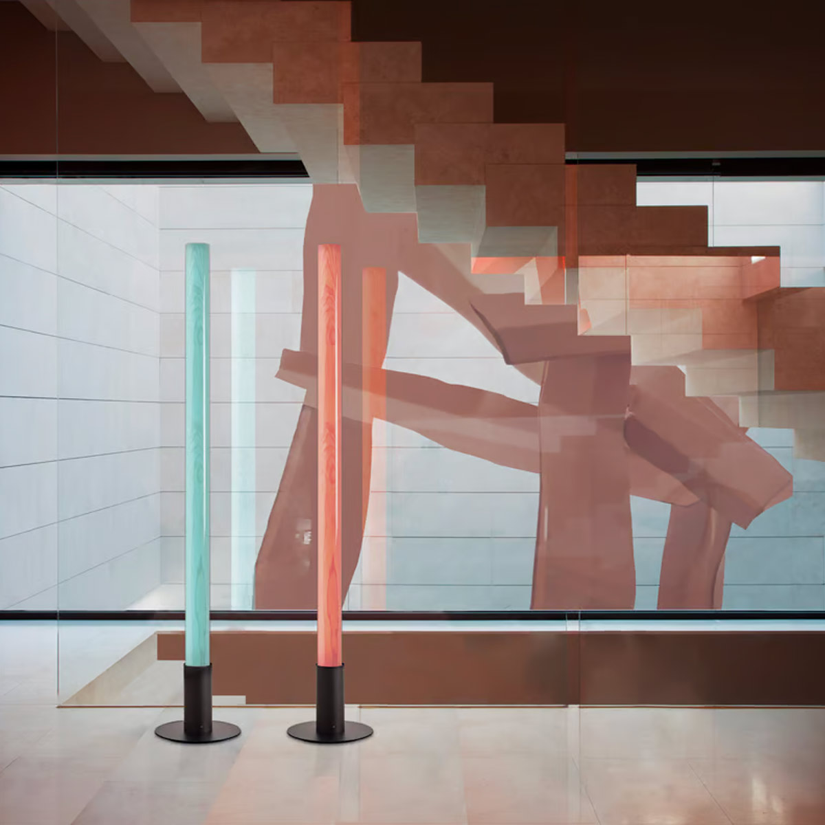Estela est une capsule de lumière captivante. Mayice a conçu une seule pièce de verre borosilicaté, propre et transparente. Soufflé à la main par l'artisan accompli Eduardo Garuti, le verre enveloppe un diffuseur cylindrique en placage de bois. Le placage en bois abrite une source de lumière LED à intensité variable et une ouverture droite sur un côté émet une lumière vers le bas qui est adoucie par le verre. Offrant une connexion transparente entre le verre et le bois, Estela est une lampe rayonnante d’une qualité céleste.