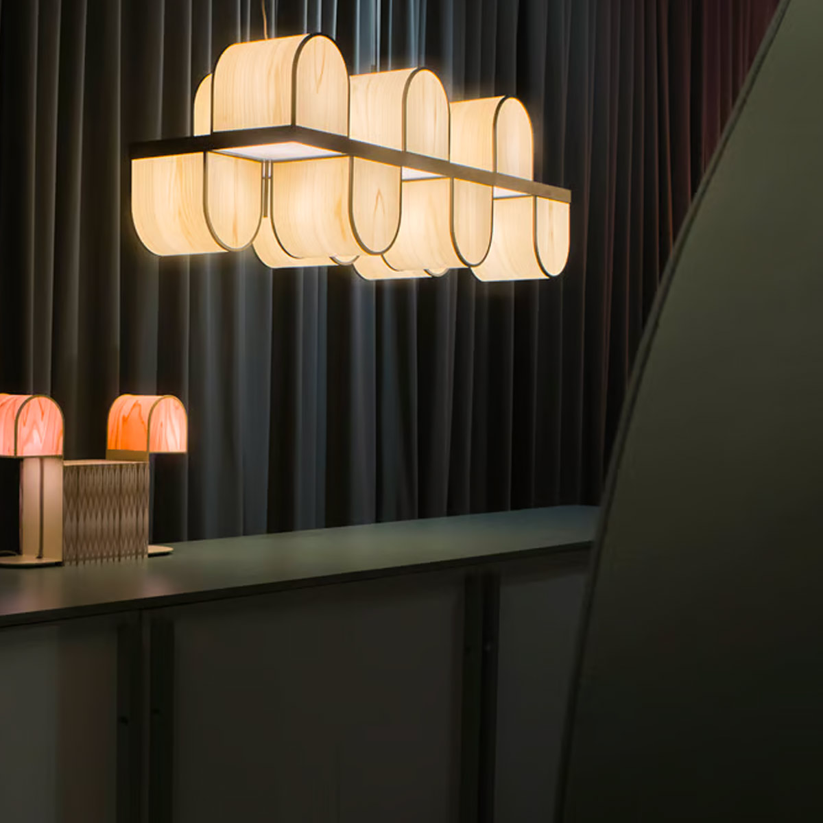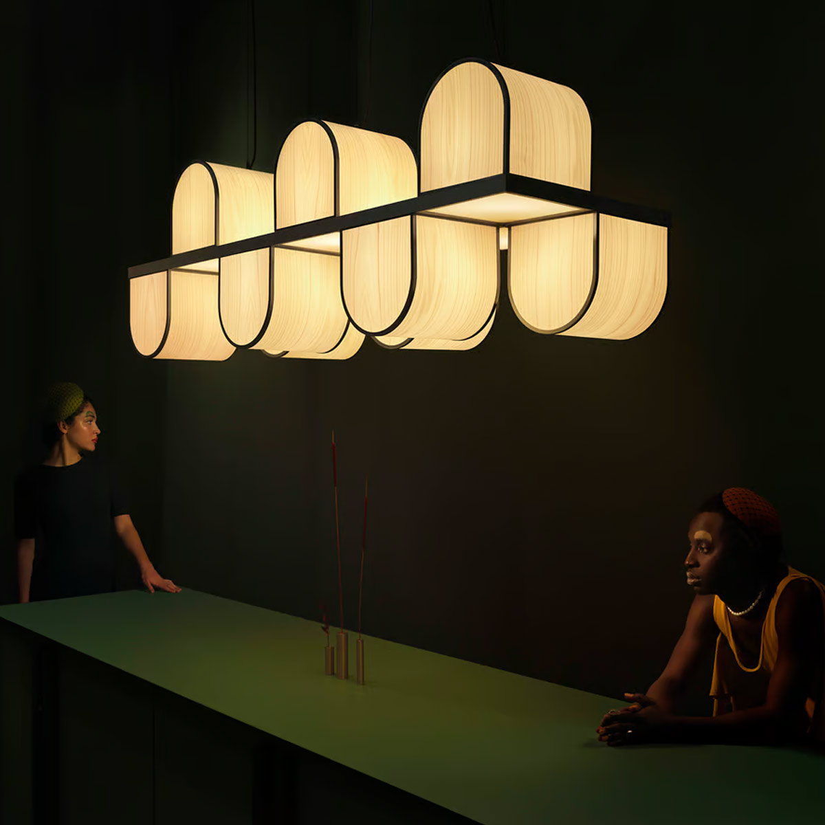 Osca est une lampe d'inspiration architecturale à l'esthétique cubiste. Dans la lampe à suspension Osca, de simples arcs de placage en bois tridimensionnels imbriqués sont orientés vers le haut et vers le bas, donnant à la lampe une forme sculpturale unique. La grande lampe à suspension est créée par l'union de trois petites Oscas, lui donnant un aspect sculptural spectaculaire de lumière et d'ombre.