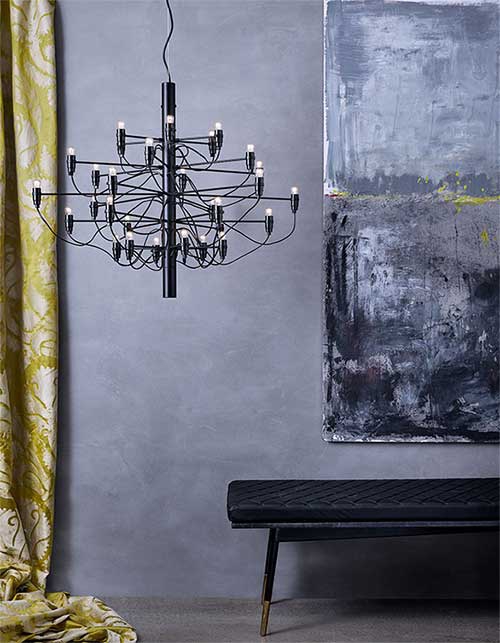 2097 Designed by Gino Sarfatti Partant de l'esthétique classique "Lustre", Gino Sarfatti a dessiné 2097 en 1958. Les ampoules et les câbles sont exposés, ce qui donne une forme moderne et minimaliste. La suspension 2097 est disponible en 2 tailles, le nouveau modèle noir mat s'ajoute aux finitions laiton et chrome. Découvrez 2097 de Flos |