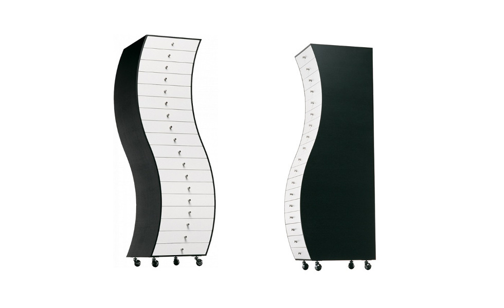 Retrouvez également des créations poétiques et étonnantes comme les meubles de Shiro Kuramata ! Dessinée en 1970, cette série de commodes de formes différentes part dans l'idée d'une colonne, les tiroirs se succèdent dans une esthétique de la pile, où se pose un questionnement sur la perversité de la perspective. En effet, alors que chacun des éléments sont d’une dimension identique, l’oeil tend à percevoir des différences entre eux. Cette fausse impression permet de créer un ensemble fluide, qui donne un sentiment de vie substantiel. Dans un esprit moderne, il appose sur chaque tiroir un bouton d’acier, qui marque le déplacement de la courbe en pointillé. Ne perdant pas le point de vue fonctionnel, la commode est montée sur quatre roulettes, afin de permettre son déplacement dans l’ensemble de l’intérieur.