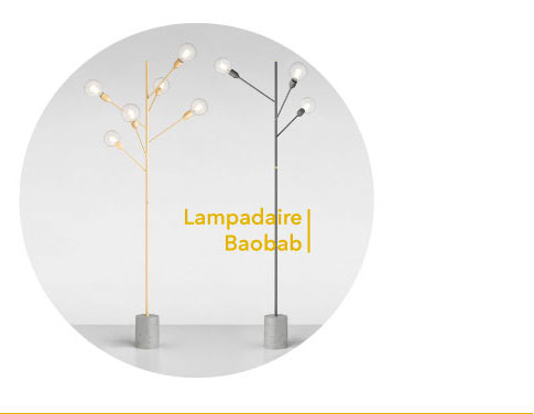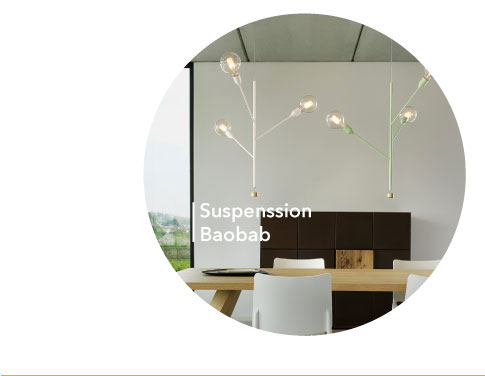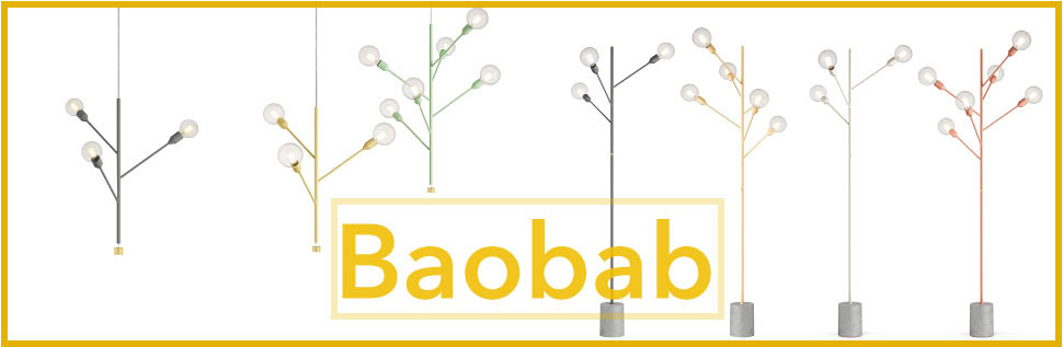La collection a été créé par Paolo Grasselli et conçue à partir d’une structure métallique légère dont les ramifications s’étendent pour former les branches de la lampe. Ses branches sont des lignes de désir qui poursuivent la lumière et créent dans l’espace des entrelacs harmonnieux. Baobab assouvit l’éternelle recherche de la beauté à travers un jeu léger de lumières, de géométries et de transparences. Les ampoules de grandes dimensions qui se trouvent aux extrémités d’une armature métallique quasiment imperceptible apportent du caractère à la composition. Clin d’œil au design italien des années cinquante, un contrepoids en métal de qualité supérieure maintient l’alignement de la frêle structure et assure l’équilibre statique et le galbe de la suspension. Suspension ou lampadaire, Baobab est disponible en version trois ou six branches et dans divers coloris pastel et métalisé qui sauront ravir tous les styles d’intérieur.