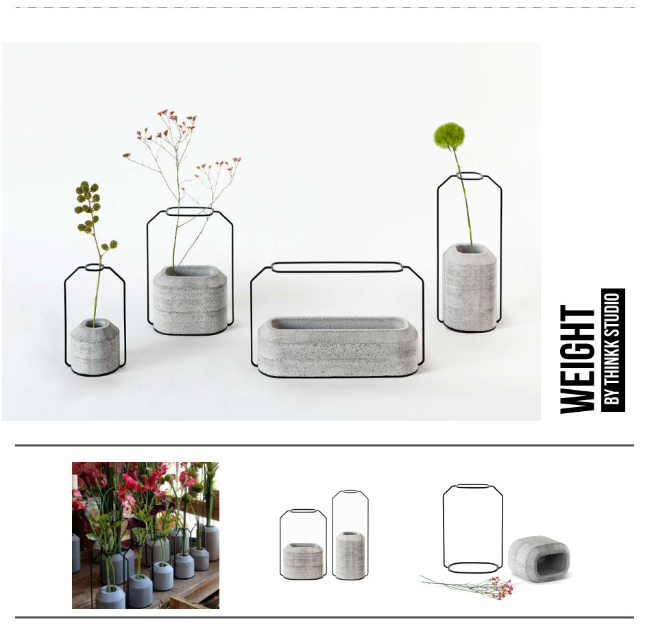 Il renouvellent la composition florale. Depuis la période néolithique, tous les vases perçoivent le même objectif simple : recevoir des fleurs. Le vase se divise donc en deux parties aux utilités distinctes : une partie haute qui maintient les fleurs et une partie basse qui reçoit de l’eau et qui stabilise l’ensemble. Le dessin des vases «Weight» s’appuie sur ce regard et vient affirmer la séparation des parties hautes et basses. La partie contenant l’eau, réalisée en béton est surmontée d’une partie en acier qui joue le rôle de tuteur.