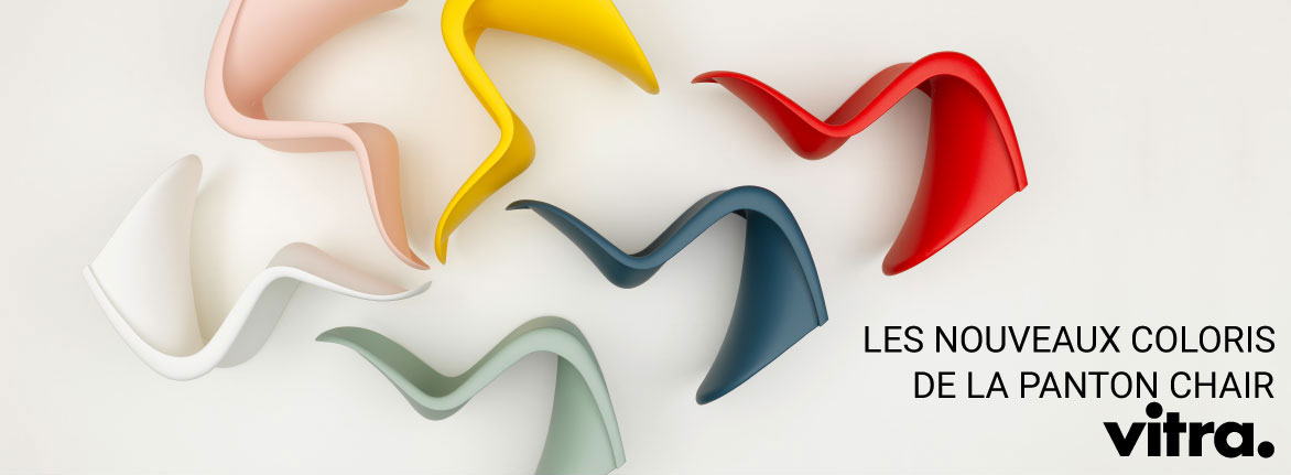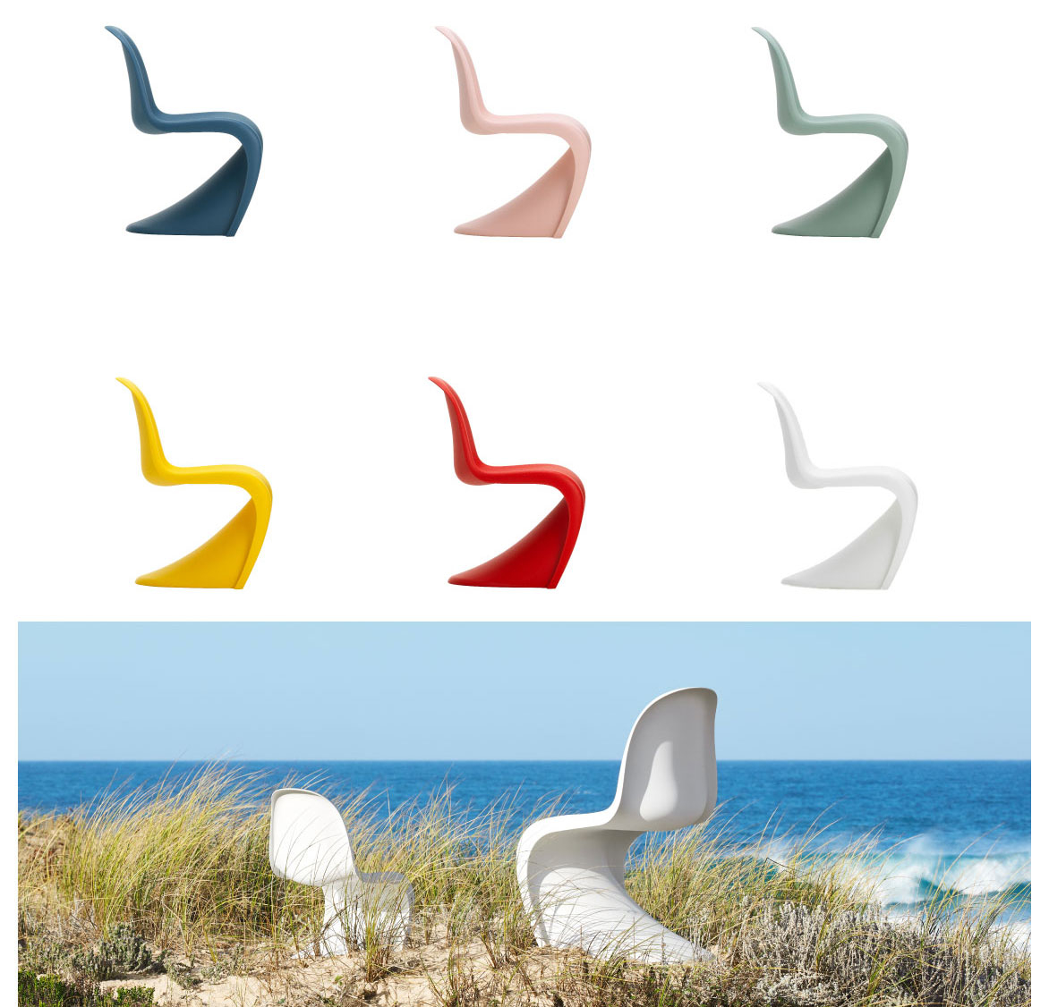 Chaise Panton classique existe dans de nombreux coloris : bleu glacier, rose tendre, menthe, bordeaux, noir, rouge classique et blanc.