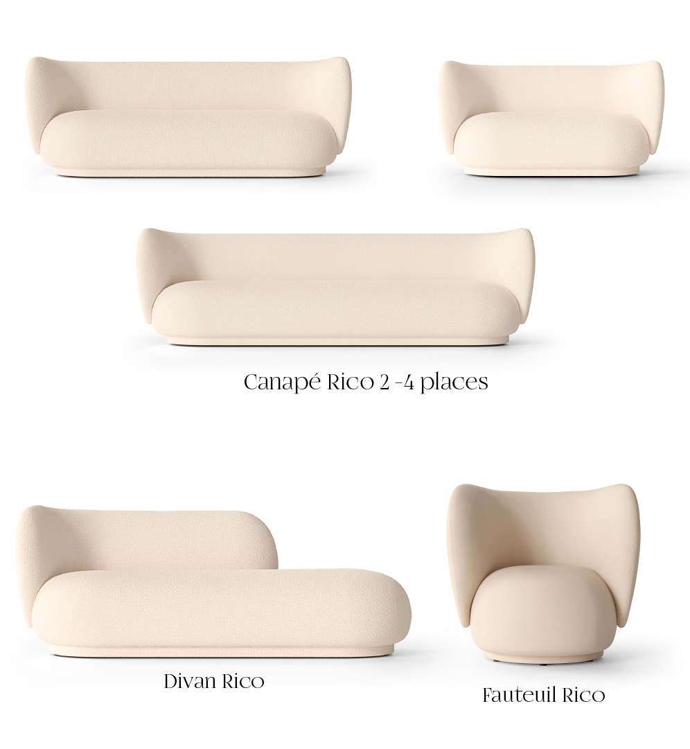 La série Rico accueille les courbes et les volumes dans un design classique défini par des lignes douces et une expression enveloppante. Contrastant avec la robustesse de la structure, le fauteuil a un rembourrage en tissu bouclé intemporel mais facile, qui est tissé de fils irréguliers pour obtenir la texture riche et bouclée de la surface. La nature tout en courbes de la série ajoute une union moderne de confort et d'élégance à n'importe quelle pièce et vous fait sentir les propriétés par son étreinte maternelle.