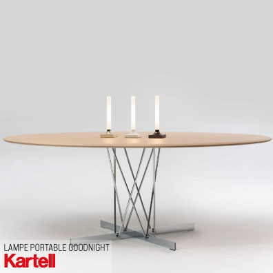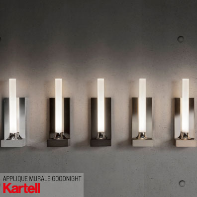 L’exploration de Starck se poursuit avec la source de lumière la plus romantique : la bougie, avec ses reflets doux et chauds. Goodnight revisite le concept et la forme primordiale de la bougie en la transformant en un objet hautement technologique. Disponible en applique murale et à batterie, la lampe fournit un éclairage de très longue durée ainsi que trois niveaux d’intensité différentes. "La lumière des bougies était la le premier phare de notre civilisation. Avec Goodnight, Kartell réinvente la pureté de cette lumière iconique pour préserver nos rêves." Starck.