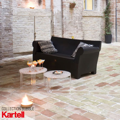 La collection Bubble de Kartell, intérieur ou extérieur est très résistant, idéal pour terrasses ou jardins, puisque doté d'une gouttière pour l'évacuation de l'eau de pluie. Bubble Club, en polyéthylène teinté dans la masse, est le premier exemple d'un nouveau concept de décoration d'intérieur : le divan industriel, entièrement réalisé en plastique. Le canapé Bubble Club est un divan à deux grandes places caractérisé par la ligne douce de ses accoudoirs en contraste avec celle plus minimaliste et rationnelle de son dossier. Avec le fauteuil et la table coordonnés, réalisés dans les mêmes finitions et couleurs, Bubble Club constitue un véritable « salon industriel ». Grâce à leur exceptionnelle résistance aux agents atmosphériques, les trois éléments de la ligne Bubble sont particulièrement adaptés à un usage externe.