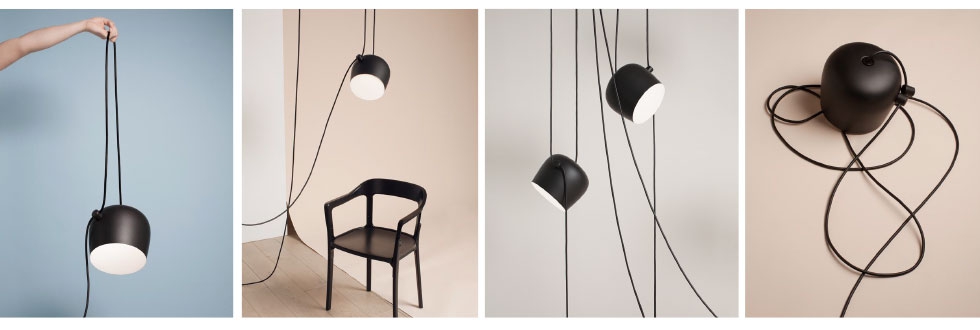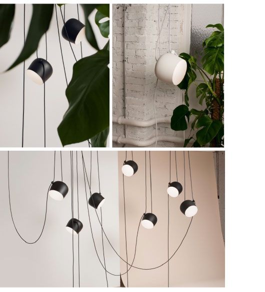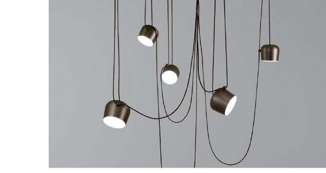 Les lampes Aim des frères Bouroullec, qui peuvent être utilisées individuellement ou dans de multiples installations, créent un enchevêtrement de câbles qui semblent se développer et se développer comme des branches ou des plantes grimpantes. Les deux designers confirment que la nature et sa contemplation constituent leur principale source d’inspiration. En regardant la simplicité et le naturel des formes organiques, ils créent des objets simples et basiques