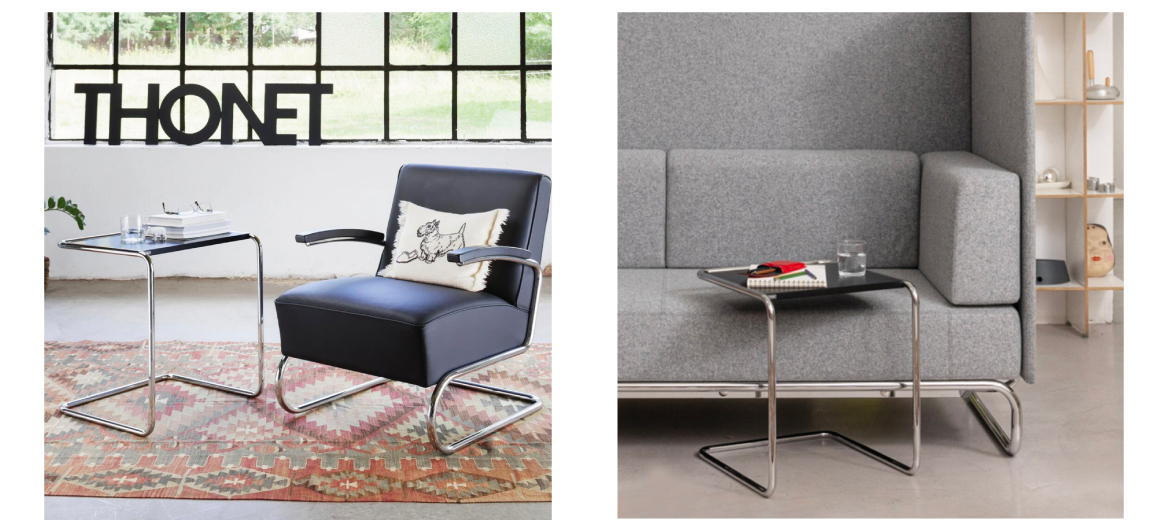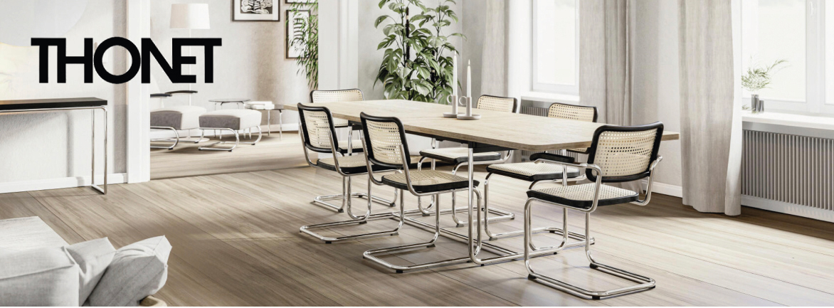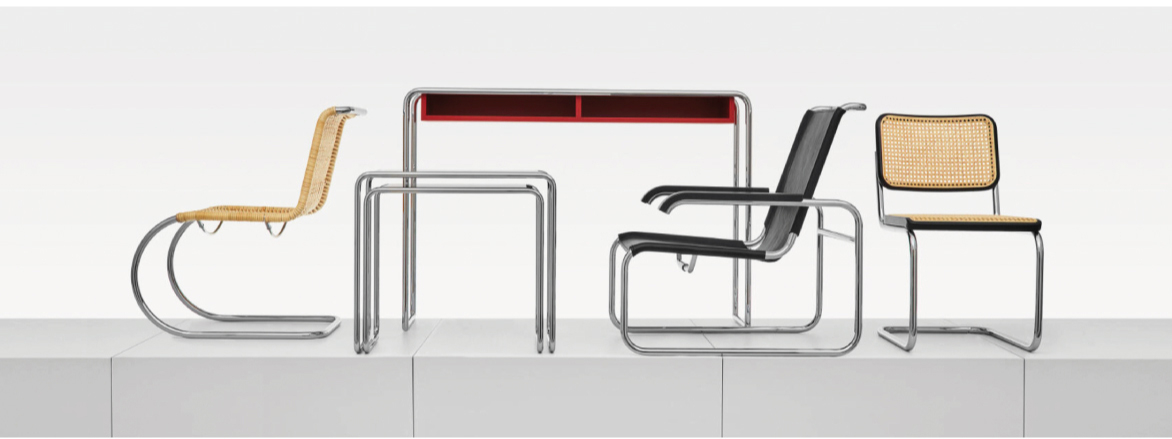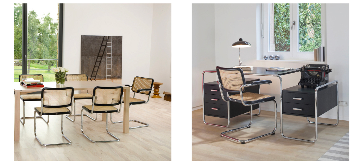 À peu près à la même époque, soixante-dix ans après le développement de la chaise n° 14 (aujourd'hui 214), Marcel Breuer crée ses premiers objets de design d'intérieur en tube d'acier. Après le rachat de la société Standard Möbel cofondée par Breuer, Thonet a produit les conceptions de Breuer à partir de 1930. Les classiques actuels en acier tubulaire S 32 et S 64 ont été créés. Ce sont des liens importants entre la technique traditionnelle du bois courbé et le cintrage moderne de l'acier tubulaire. Leur travail de l'osier viennois rappelle l'artisanat traditionnel, et leur design définissant l'espace avec sa fonction (la chaise en porte-à-faux initiée par Mart Stam) pointe déjà vers l'avenir. Avec la chaise en tube d'acier S 35, présentée pour la première fois en 1930 lors de la « Section Allemande », une exposition du Deutscher Werkbund à Paris. En tant qu'architecte à Berlin, Breuer a meublé les maisons d'artistes et d'intellectuels avec des meubles innovants jusqu'au début des années 1930. Les artistes modernes, au-delà de l'environnement direct du Bauhaus, se sont très tôt enthousiasmés pour les meubles Thonet. Dans les années 1930, l'entreprise était le plus grand producteur de meubles innovants conçus par de célèbres architectes d'avant-garde tels que Marcel Breuer, Mart Stam, Ludwig Mies van der Rohe, Le Corbusier et Charlotte Pérriand. Les meubles en tube d'acier ont été fabriqués avec une technologie de production entièrement nouvelle dans l'usine de Frankenberg/Eder, siège de l'entreprise depuis la fin de la Seconde Guerre mondiale. Aujourd'hui, les premières conceptions de meubles en acier tubulaire sont des jalons célèbres de l'histoire du design.