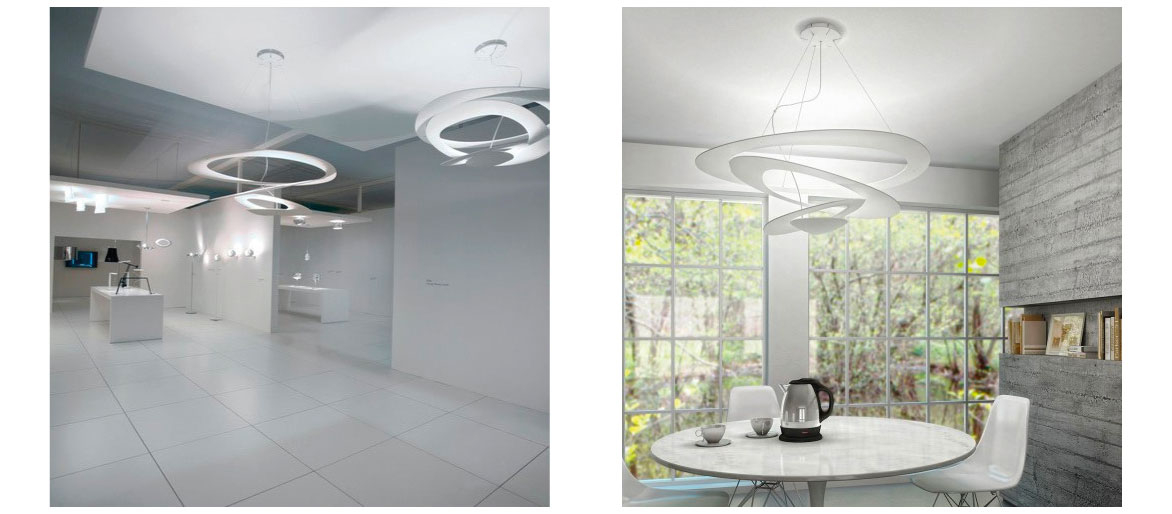 La suspension Pirce Mini se compose de spirales découpées dans un grand disque d'aluminium verni. La source est située sur la coupole du bas. La lumière, dirigée vers le haut, rebondit sur les spirales réfléchissantes. Ce ruban lumineux joue avec les ombres pour un effet magique... Cette suspension possède un style aérien et graphique. Un disque mince donne naissance à des volutes flottantes qui retombent doucement vers le bas en créant des effets magiques de forme et de lumière. Sublimez votre intérieur grâce à Pirce !