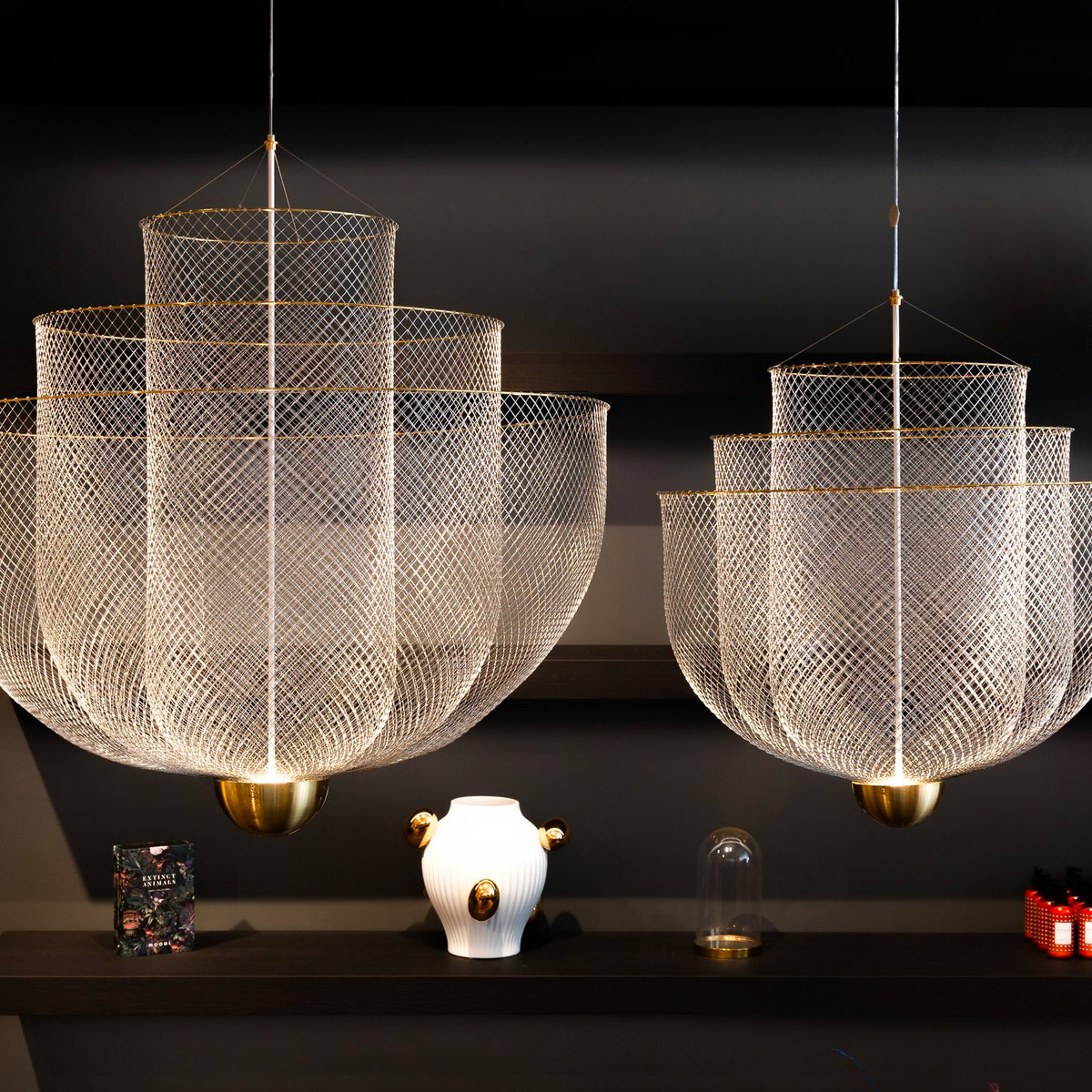 Celui qui jette son regard sur le lustre Meshmatics ne devinera jamais ce qui se cache derrière son extérieur sophistiqué ... Inspiré, Rick Tegelaar relève la nature de la matiére de l'humble grillage développé à l'aide de machines et d'un ensemble d'outils pour modéliser avec précision. Toute le potentiel de ce matériau flexible, réside dans la façon de l'étirer et le modéliser en trois couches élégantes. L'intelligence de la structure de treillis métallique reflète et diffuse la lumière de la LED intégrée avec une grâce poétique, pour contribuer à maintenir la source lumineuse fraîche en absorbant une partie de sa chaleur. Des transparences ludiques traversent le cadre ingénieux de la lampe, créant des reflets scintillants.