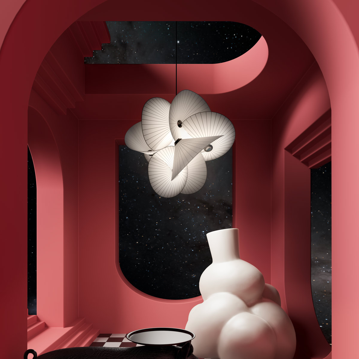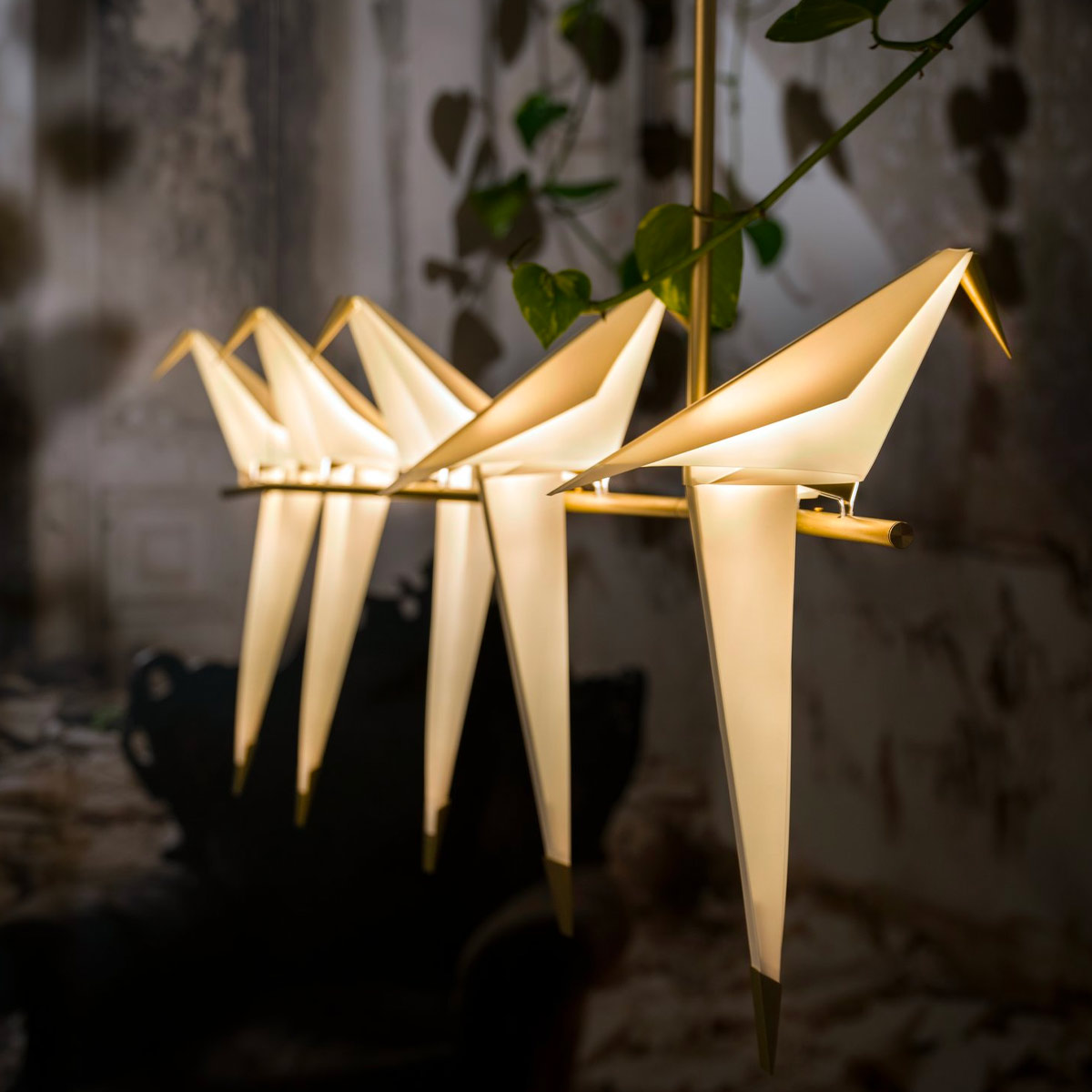 Quoi de plus poétique et d'une élégance captivante qu'un oiseau perché sur une branche, flirtant, chantant et célébrant la vie ? Nous reconnaissons tous cette image et volons un moment de notre temps précieux pour admirer ce triomphe de la nature et de la beauté. Inspiré par une telle gloire naturelle et fasciné pour toujours par la combinaison de l'équilibre et du mouvement, Umut Yamac a créé la famille Perch Light. Une série de lampes abstraites sculpturales, en papier plié et laiton, se dévoilent sur leurs perchoirs métalliques, comme des oiseaux gracieusement balancés sur une branche. Ces oiseaux ensoleillés sont libres de se balancer lorsqu'ils sont doucement touchés, brillants et apportant la promesse du printemps.