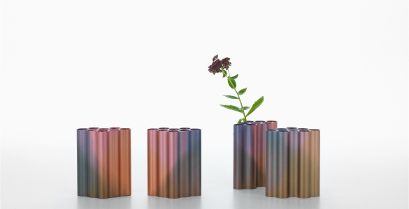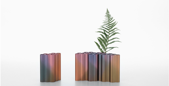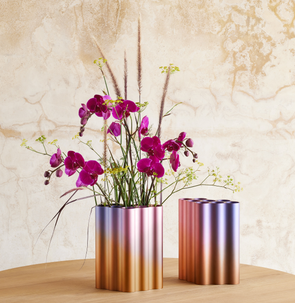 La forme des vases Nuage réalisés en aluminium anodisé crée un jeu d’ombre et de lumière captivant. Chacune des huit cabines individuelles peut être utilisée pour des compositions esthétiques de fleurs et de graminées ; grâce à leurs contours extérieurs précis, les vases peuvent être assemblés de manière à créer de véritables « formations nuageuses ». L’édition limitée Nuage abstrait est fabriquée selon un procédé au cours duquel chaque vase est immergé dans une série de solutions anodisées colorées pendant une durée déterminée. Elle reflète l’interprétation abstraite du design par Ronan Bouroullec, conférant à chaque vase la qualité d’une sculpture avec un dégradé de couleurs unique.