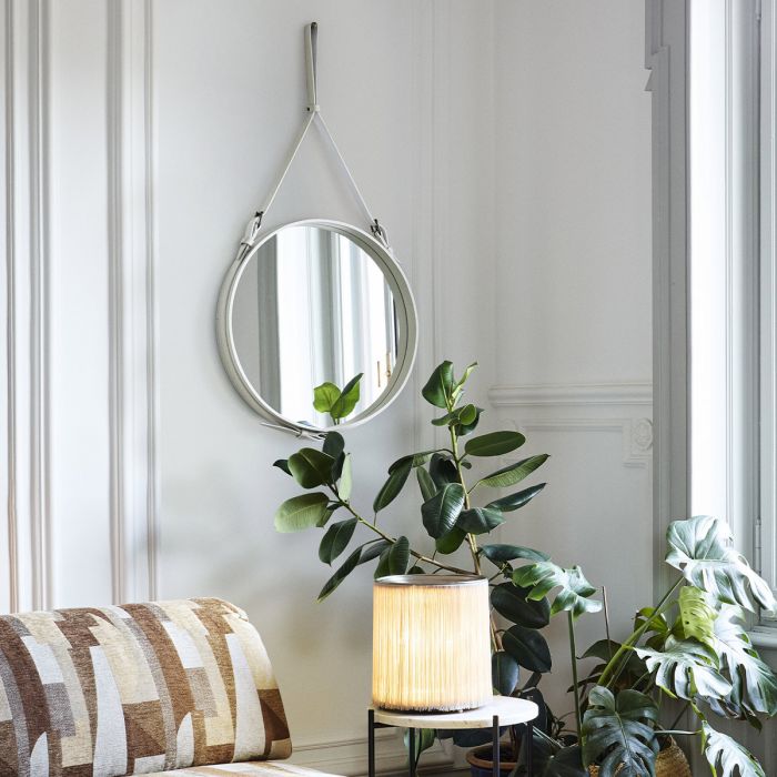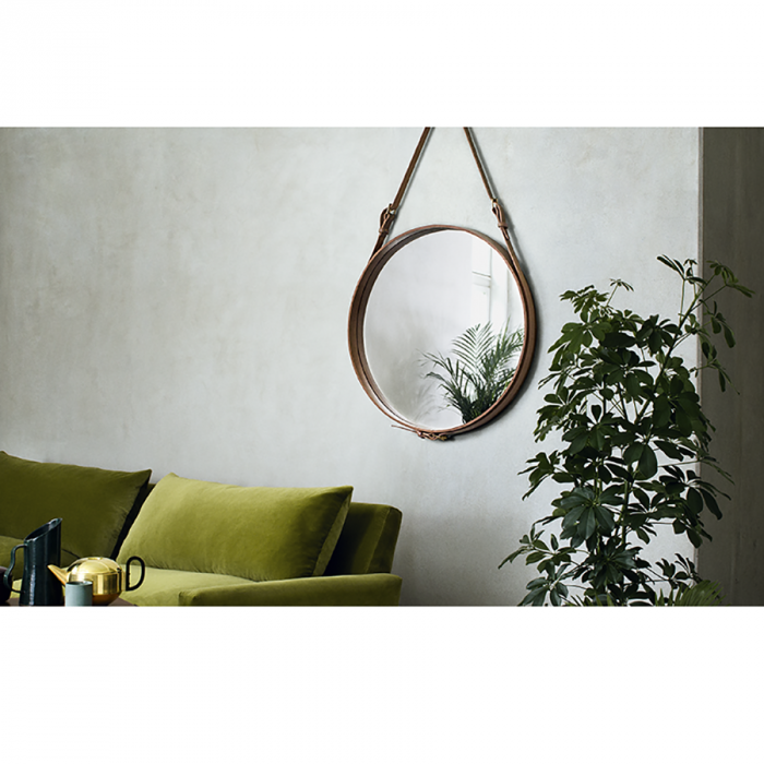 Adnet Miroir de Gubi. L'Art Déco est un art éclectique et un style de design qui a commencé à Paris dans les années 1920 et a prospéré au niveau international dans les années 1930, dans l'ère de la Seconde Guerre mondiale. Jacques Adnet est un designer de meubles plus connu pour ses créations Art déco moderniste et une icône du modernisme français. Connu pour ses créations avant-gardistes, Adnet a été l'un des premiers à intégrer le métal et le verre dans la structure et la décoration des meubles. Son style est la quintessence du luxe. En 1950, Adnet a formé un partenariat avec la maison de couture française Hermès, où il a développé une collection de meubles recouverts de cuir et accessoires d'intérieur. En conséquence, il a fait un miroir rond en cuir avec des charnières en laiton. En plus des détails remarquable du cuir et du laiton, le miroir est également unique comme la sangle qui le maintient est qui directement proportionnelle à sa dimension. Le mariage de pluisieurs matières fait de ce miroir un objet design incontournable qui donnera à votre intérieur une touche originale.