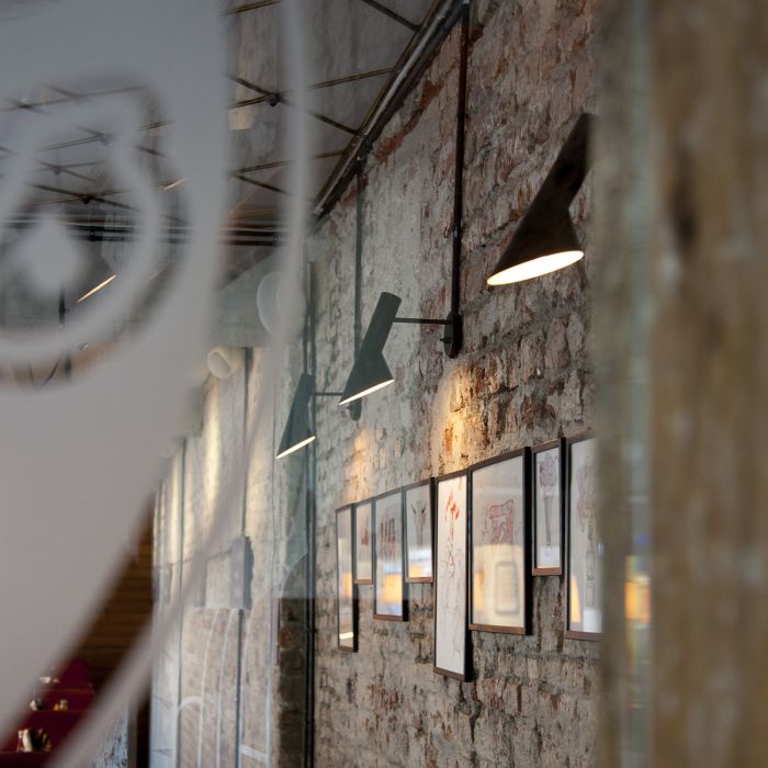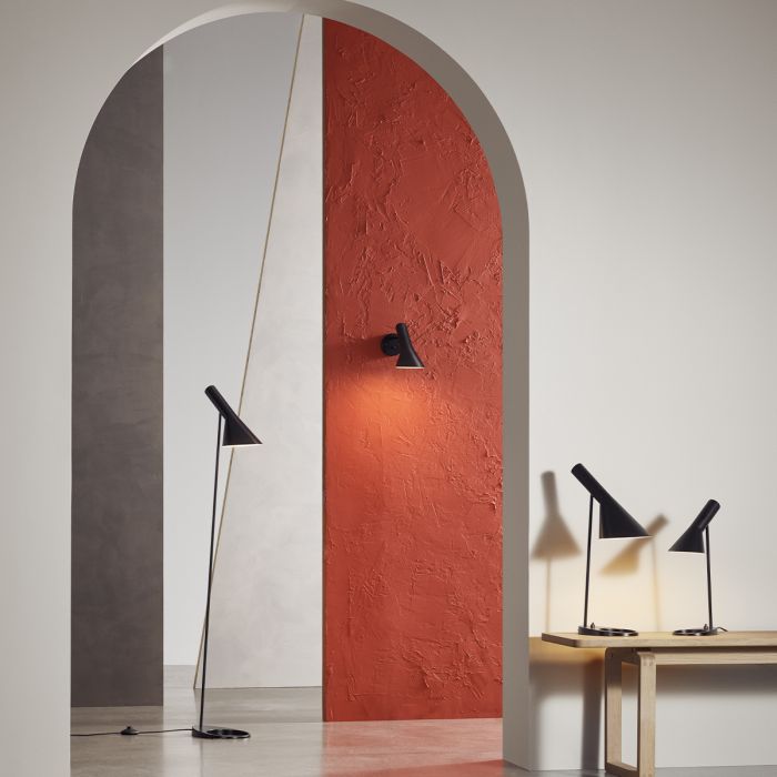 Arne Jacobsen a imaginé la lampe AJ pour le SAS Royal Hotel de Copenhague (Radisson Collection) en 1957. La série AJ est aujourd’hui considérée comme le modèle qui a fait connaître l’architecte danois dans le monde entier. À l’époque, la famille AJ comprenait une lampe de table et un lampadaire, une applique, une petite lampe de table et une lampe de table conçue pour se fixer à la table. L’applique en acier inoxydable était disposée en superbes alignements dans le hall de l’hôtel lors de son ouverture en 1960.