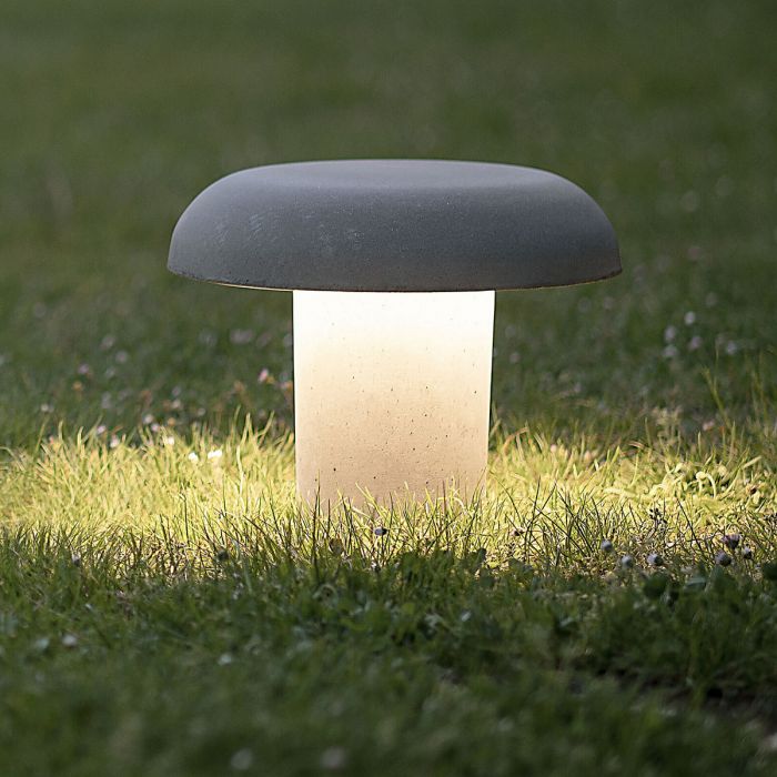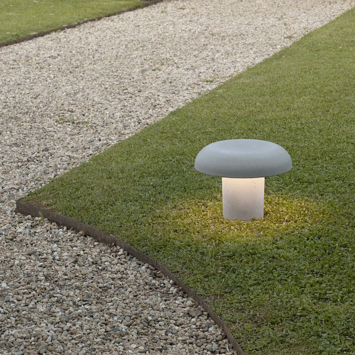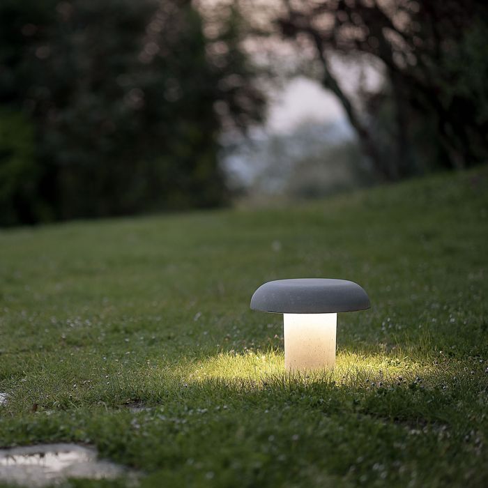 Lampe d'extérieur en béton très résistant et imperméable. Le diffuseur inférieur du chapeau est en polycarbonate satiné pour diffuser la lumière de la source lumineuse LED, avec alimentateur intégré. Base métallique pour bloquer et fixer la lampe sur le béton. Degré de protection : IP65