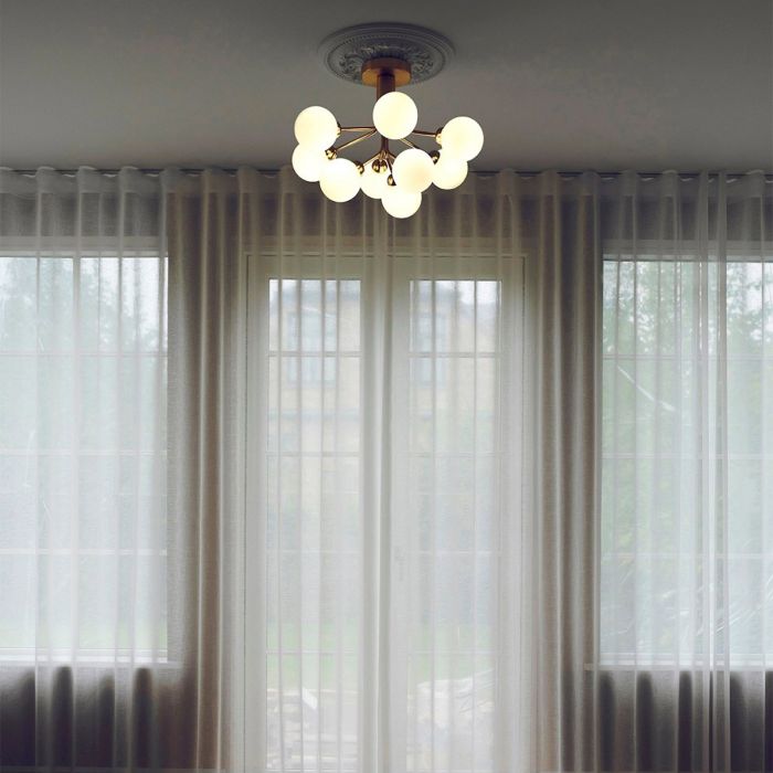 S'inspirant des fleurs, Sofie Refer a conçu la nouvelle collection de lustres, Apiales. Apiales 9 Ceiling est un lustre de plafond avec 9 globes en verre soufflé à la bouche et est disponible en finition laiton brossé doré. D'une verrière spécialement produite, les bras se déploient comme des tiges de fleurs d'où la lumière se diffuse avec grâce. Le plafond Apiales 9 a une faible hauteur de seulement 40 cm. Cela donne au lustre une grande flexibilité dans son application et permet d'accrocher un lustre dans des pièces avec des plafonds inférieurs ou dans des espaces intermédiaires.