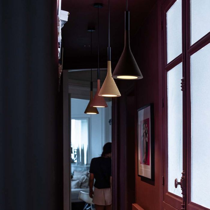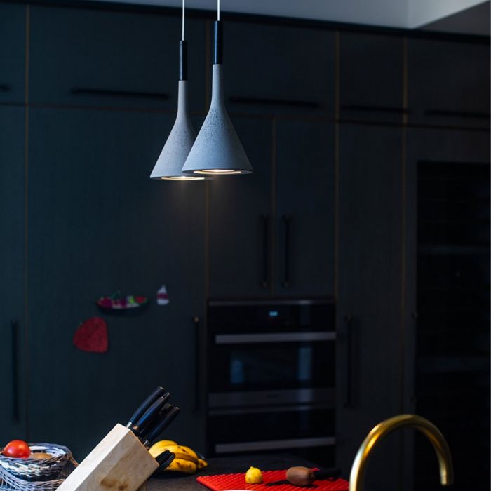 Projetant un faisceau lumineux concentré vers le bas, les suspensions Aplomb mettent en scène un ciment spécial obtenu à partir d’un mélange exclusif : un modèle extrêmement raffiné qui exalte la matière.