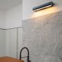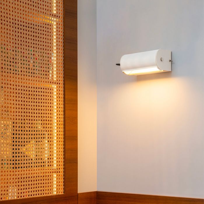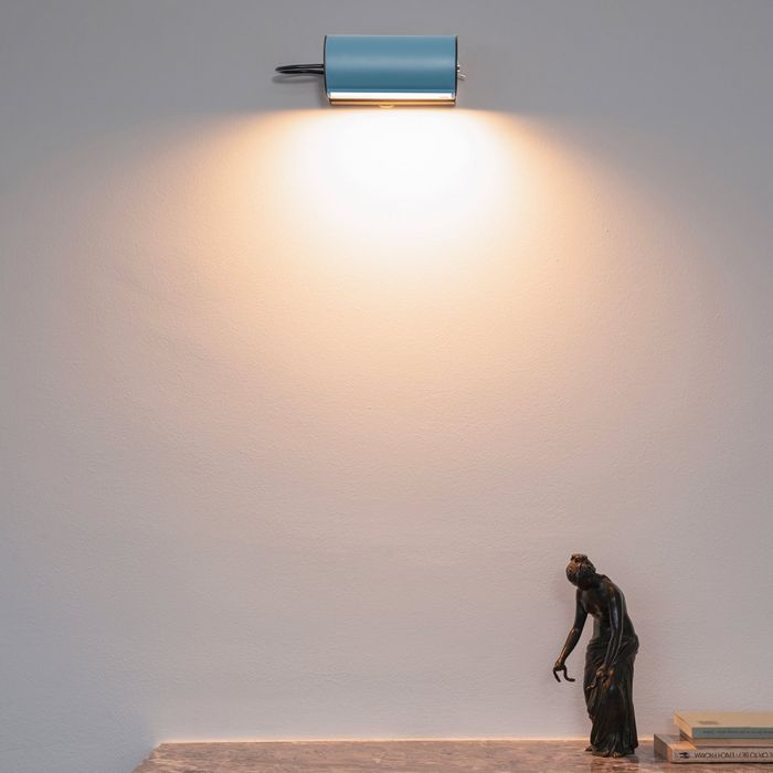 Applique LED avec abat-jour cylindrique disponible en deux tailles (Longue e Petite) en métal peint bleu clair. L'intérêt de Perriand pour les écrans pivotants reflète son observation des gestes humains: un simple toucher permet de contrôler et de diriger le faisceau lumineux.