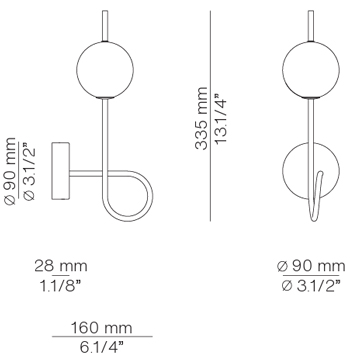 Applique murale avec structure tubulaire métallique courbée et LED intégrée à intensité variable. La sphère en verre opale assure une diffusion de lumière douce et uniforme. Peut être installée avec la sphère orientée vers le haut ou vers le bas, selon les besoins du projet.