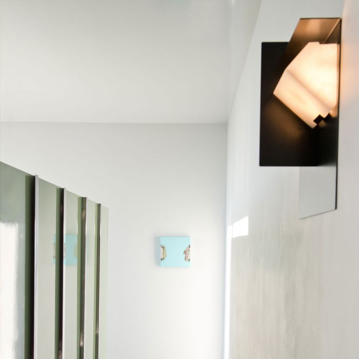 Créée en 1923, ce module présente à la fois une géométrie rigoureuse et un volume simple permettant de révéler la nature minérale de l’albâtre et le choix minimaliste de Pierre Chareau renforcé par l’opposition métal (noir) et albâtre (blanc).