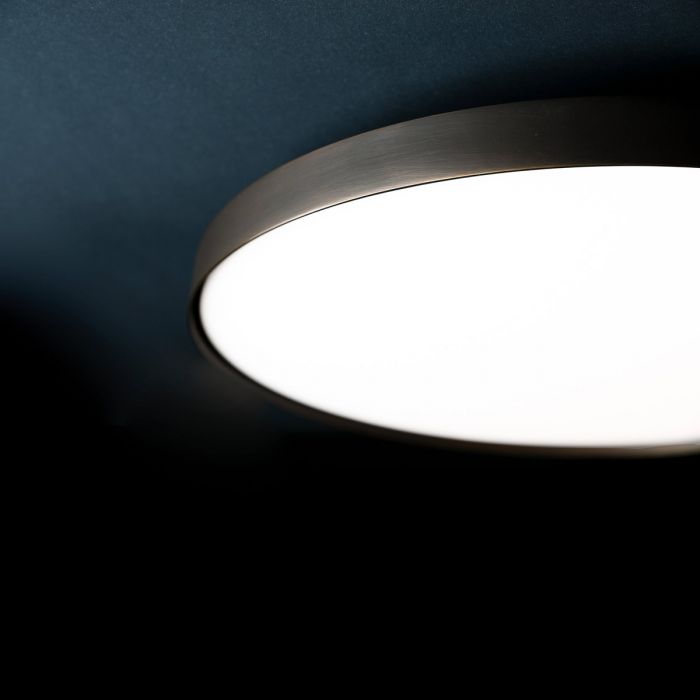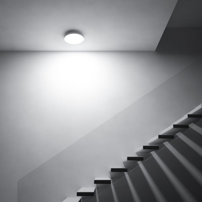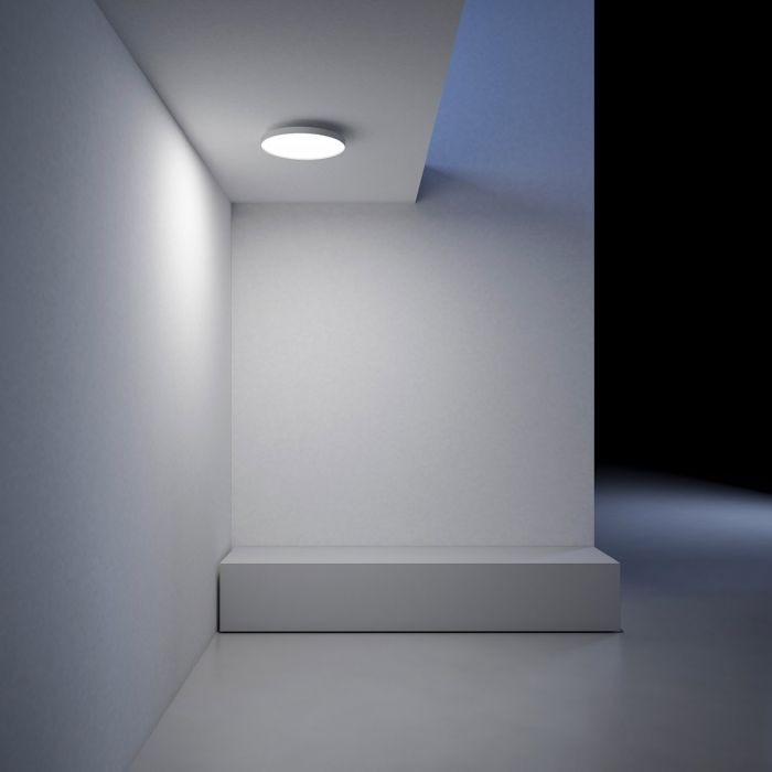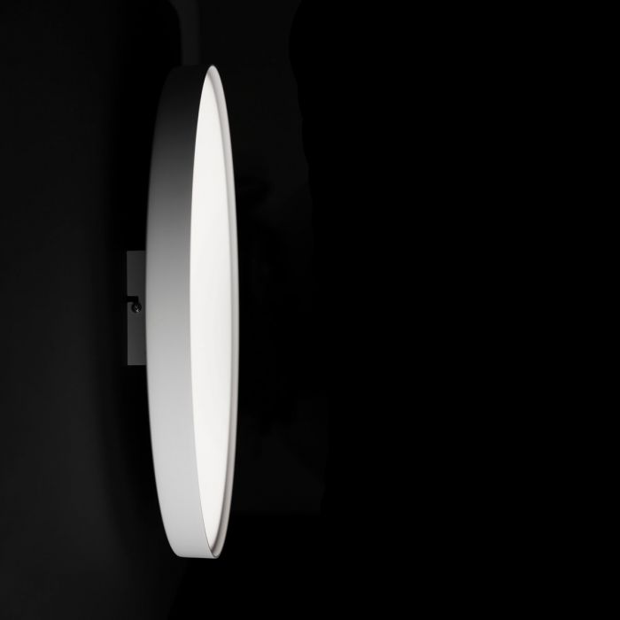 Aurora de David Groppi. Un disque blanc, représentation parfaite de la lumière diffuse. Il peut être appliqué au plafond ou au mur et il est modulable dans toutes les intensités.