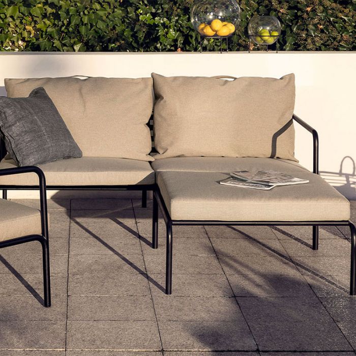 Le cadre sans entretien et la construction des grands coussins de dossier moelleux sont exactement cela - la simplicité de la structure, où les lignes basses garantissent que le design semble toujours fier, avec et sans coussins - été ou hiver. Les poignées des coussins, est une déclaration à la fonction du produit, ce qui les rend facile à saisir et à ranger si nécessaire.