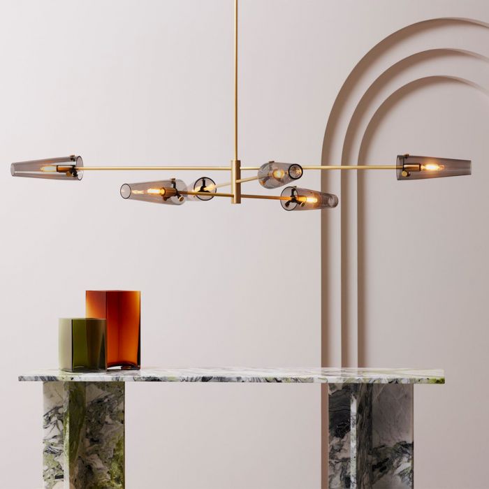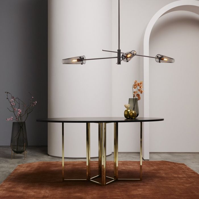 Une suspension décorative moderne, inspirée des lampadaires antiques, qui allie forme linéaire et détails décoratifs pour offrir une combinaison unique qui constitue une superbe pièce maîtresse dans un intérieur. Fini en laiton satiné ou en bronze avec des abat-jour coniques en verre fumé. Évoquant les lampadaires anciens, AXIS est une superbe suspension contemporaine avec une touche rétro. Doté d'abat-jour coniques en verre fumé suspendus à un cadre en laiton satiné ou en bronze, AXIS trouve l'équilibre avec une forme parfaitement équilibrée. Le profil linéaire du grand luminaire suspendu s'adapte sans effort aux longues tables rectangulaires et aux îlots de cuisine. Pour les espaces plus arrondis, comme au-dessus d'une table à manger ou d'une table basse circulaire, les trois bras de la version plus petite sont joliment positionnés et proportionnés. Les deux tailles de suspension AXIS sont fixées au plafond à l'aide d'une rosace et d'une tige de suspension en laiton qui peuvent être fabriquées sur mesure pour s'adapter à votre espace.