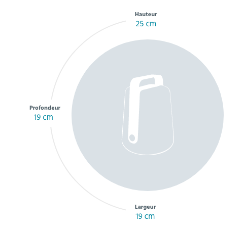 Balad Lampe H25 cm de Fermob par Tristan Lohner. La lampe Balad est une création joyeuse, accessible, colorée. Un produit connecté dans la modernité, un objet déco dans l’épure, tout en rondeur, sans superflu, un vrai coup de cœur qui séduit autant par son look que par son prix tout doux. Sans fil, cette lampe LED se déplace au gré de vos envies : petite lampe d'ambiance dans votre salon ou votre entrée, elle est idéale en veilleuse dans une chambre d'enfant (elle ne chauffe pas). Dans votre jardin ou sur votre terrasse, elle sera parfaite sur une table pour créer une ambiance lumineuse tamisée lors de vos repas. Munie d'une poignée en métal, elle est facile à transporter et peut aussi se supendre à une branche d'arbre pour une ambiance magique dans le jardin. La lampe Balad sans fil se recharge via un câble USB standard (fourni). Le bouton on/off permet de choisir entre deux intensités différentes, 50% ou 100%. Une fois rechargée, Balad diffuse une lumière douce pendant 12h50 en position 50% ou 7h35 en position 100%. Vous pouvez la placer où vous le désirez sans vous préoccuper du raccordement électrique. Elle utilise la toute dernière technologie LED et associe un éclairage décoratif à une durabilité et une consommation énergétique économique.