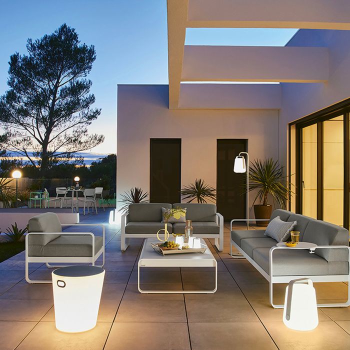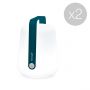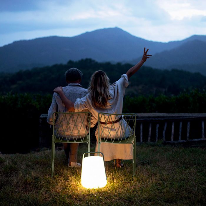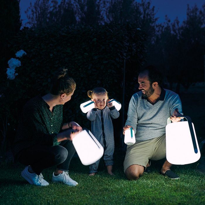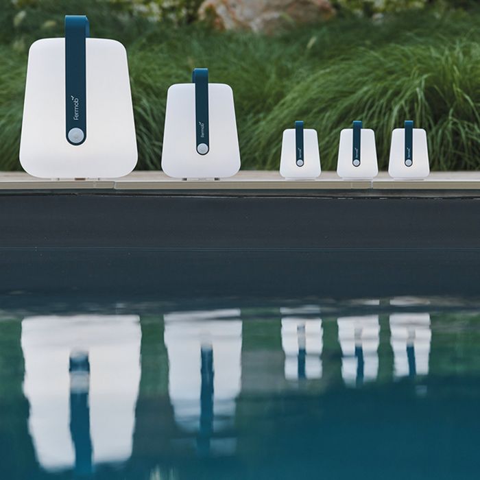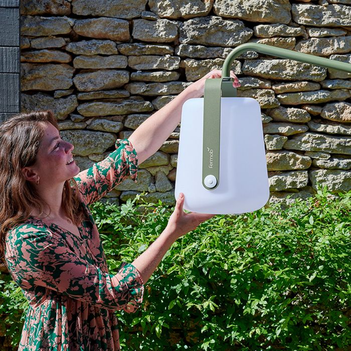 Balad Lampe H38 cm - Lot de 2 de Fermob par Tristan Lohner. La lampe Balad est une création joyeuse, accessible, colorée. Un produit connecté dans la modernité, un objet déco dans l’épure, tout en rondeur, sans superflu, un vrai coup de cœur qui séduit autant par son look que par son prix tout doux. Sans fil, cette lampe LED se déplace au gré de vos envies : petite lampe d'ambiance dans votre salon ou votre entrée, elle est idéale en veilleuse dans une chambre d'enfant (elle ne chauffe pas). Dans votre jardin ou sur votre terrasse, elle sera parfaite sur une table pour créer une ambiance lumineuse tamisée lors de vos repas. Munie d'une poignée en métal, elle est facile à transporter et peut aussi se supendre à une branche d'arbre pour une ambiance magique dans le jardin. La lampe Balad sans fil se recharge via un câble USB standard (fourni). Le bouton on/off permet de choisir entre deux intensités différentes, 50% ou 100%. Une fois rechargée, Balad diffuse une lumière douce pendant 12h50 en position 50% ou 7h35 en position 100%. Vous pouvez la placer où vous le désirez sans vous préoccuper du raccordement électrique. Elle utilise la toute dernière technologie LED et associe un éclairage décoratif à une durabilité et une consommation énergétique économique.