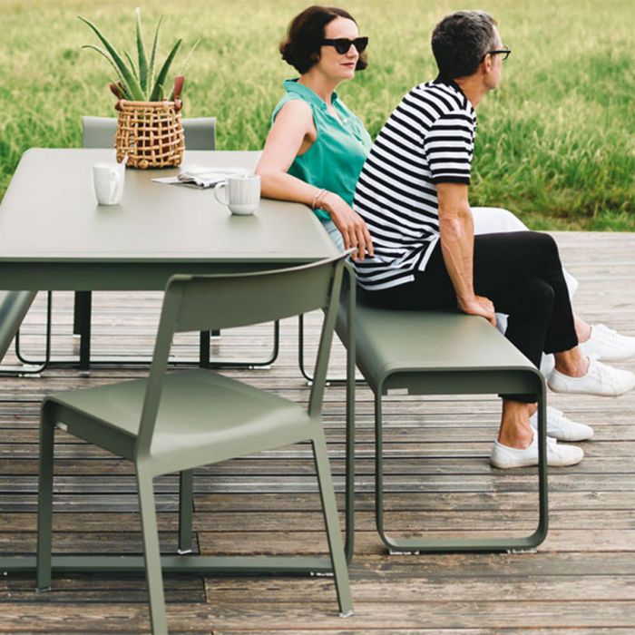 La famille Bellevie s'agrandit d'un banc d'extérieur confortable et d'allure contemporaine avec des formes géométriques et des courbes douces. Ce banc de jardin peut, au gré des va-et-vient des uns et des autres, accueillir jusqu’à 4 personnes. Solidité, stabilité et légèreté sont apportées par l'association d’aluminium et d’acier. Ce banc design joue sa partition seul, dans un jardin ou sur une terrasse, ou autour d'une table Bellevie de la même collection.