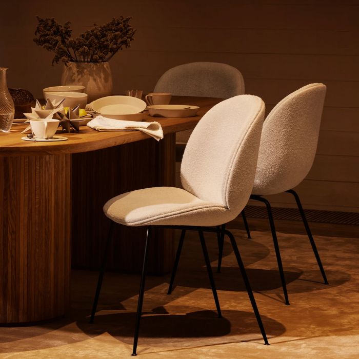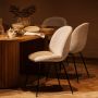 Beetle Chair Rembourré - Collection Capsule de Gubi. En raison de son design attrayant, de son confort exceptionnel et de ses possibilités de personnalisation uniques, la chaise de salle à manger peut être vue dans de nombreux restaurants les plus renommés du monde.La chaise de salle à manger entièrement rembourrée porte de fortes références à la source d'inspiration du duo de designers GamFratesi; le monde des insectes, plus spécifiquement le monde des coléoptères.