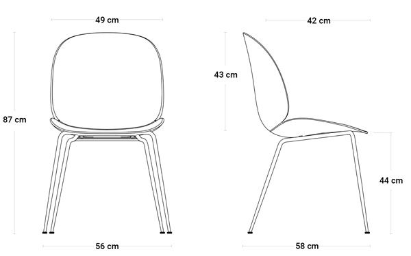 Beetle Chair de Gubi. Avec l'introduction de la chaise Beetle non rembourrée, la collection s'est transformée en une série de chaises aux possibilités illimitées. La chaise Beetle n'est plus seulement une chaise rembourrée, mais également disponible avec une coque en plastique polypropylène, ce qui lui donne une expression plus légère avec une durabilité notable à un prix inférieur. La texture mate subtile de la chaise offre une tactilité douce où son confort d'assise exceptionnel est obtenu.