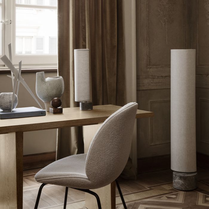 Beetle Chair Rembourré de Gubi. La collection d'assises Beetle est une série de chaises en placage moulé stratifié avec le siège et le dos en 2 parties séparées. Les 2 parties sont assemblées avec un raccord en acier fraisé dans les 2 coques. Les coquilles ont une épaisseur de 10 mm. La chaise est toujours entièrement rembourrée en tissu.