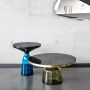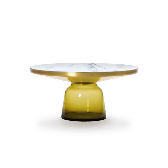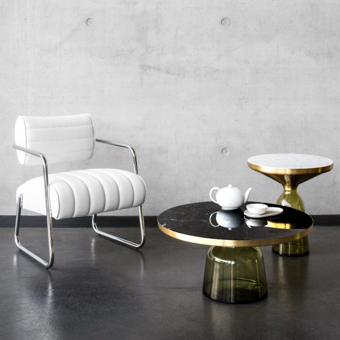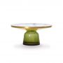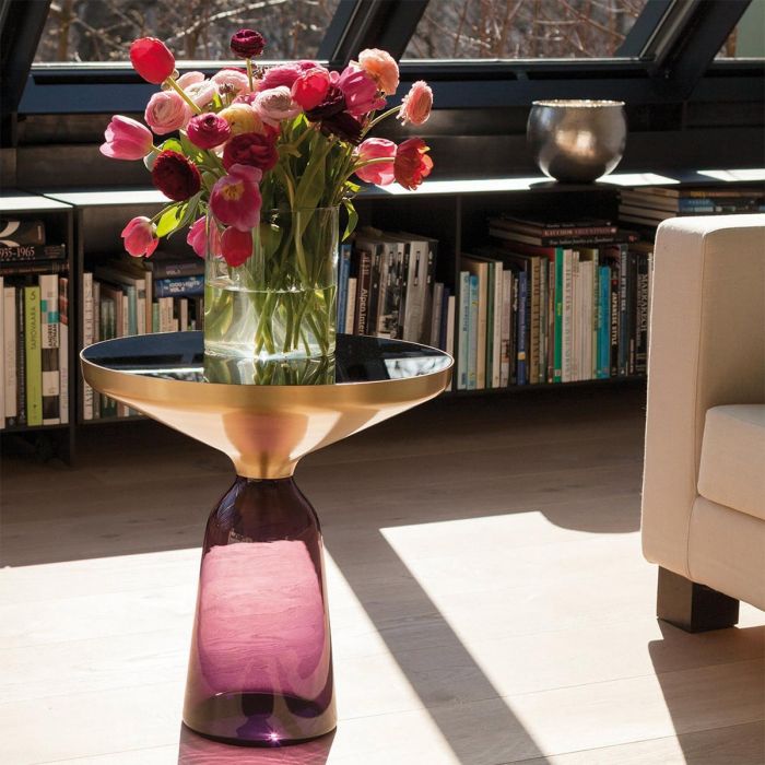 Le pied en verre traditionnellement soufflé dans un moule en bois et le corps métallique embouti créent un contraste fascinant tout en réalisant une union harmonieuse des formes qui rappelle l‘élégance d‘une cloche à la volée. Leurs réflexions attrayantes et le contraste de leurs matériaux font des Bell Table des éléments d‘intérieur au caractère affirmé.