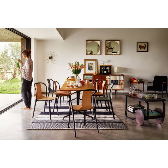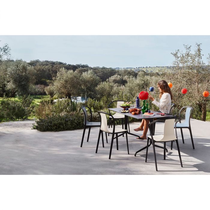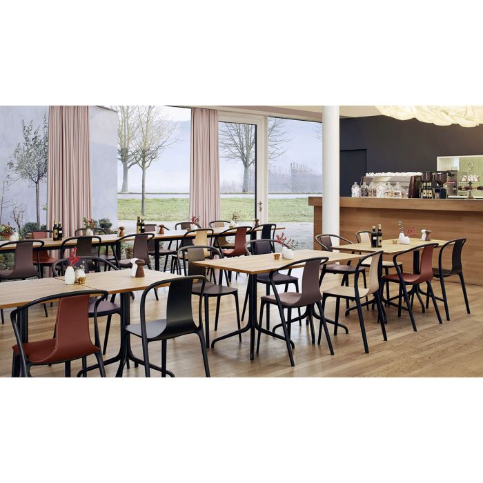 Belleville est le quartier parisien dynamique où se trouve le studio des designers Ronan et Erwan Bouroullec. Le mobilier de bistrot français classique et l’ambiance vivante de leur quartier ont été la source d'inspiration pour la Belleville Chair et les Belleville Tables – un siège en plastique inhabituel et une famille de tables dédiées aux salles à manger et aux cafétérias. La famille Belleville présente d'emblée une certaine évidence avec sa forme familière - même dans un contexte contemporain, tout en étant habitée par un côté mystérieux, un aspect quelque peu déroutant. En effet, elle ne laisse apercevoir ses matériaux, sa construction et son procédé de fabrication qu’au second regard. La Belleville est un siège en plastique faisant preuve d’un grand raffinement technique, qui se compose de deux éléments : une structure porteuse et une coque d’assise. Telle une calligraphie, un cadre noir élancé dessine les pieds et le dossier du siège et accueille une coque fine qui va en s’effilant de l'assise large vers le dossier étroit. Les Belleville forment avec les Belleville Tables un ensemble homogène et pourtant varié, une famille hybride dont le langage formel et les matériaux sont harmonieusement coordonnés. Les sièges et les tables peuvent ainsi être parfaitement associés, en petit ou en grand nombre, pour aménager des bistrots animés, des galeries à la décoration plus sévère ou des appartements aux styles les plus divers.