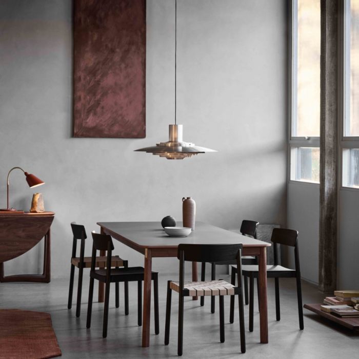 Betty Tk2 de &Tradition par Thau & Kallio. Nommée d'après le théâtre Betty Nansen de Copenhague, cette chaise empilable est disponible en deux versions : une avec une assise en sangles apparentes fabriquées à partir de fibres de lin naturelles et une autre avec une assise en bois massif.