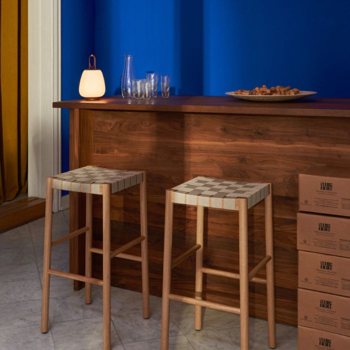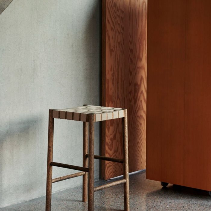 Betty Tk8 de &Tradition par Thau & Kallio. Nommé d'après le théâtre Betty Nansen de Copenhague, la structure robuste de ce tabouret est fabriquée en chêne ou en frêne laqué. Le siège palmé – dont les sangles sont fabriquées à partir de fibres de lin naturelles et tissées à la main – offre une base douce et rembourrée.