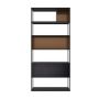 Matériaux : bibliothèque modulable démontable, 2 montants, 7 tablettes latérales, structure en tôle d’acier courbé épaisseur 1,5 mm, peinture époxy noir cuivré, plusieurs caissons sont intégrés (coloris noir cuivré sablé et bronze), 2 caissons ouverts et un caisson avec porte abattante et fermeture magnétique