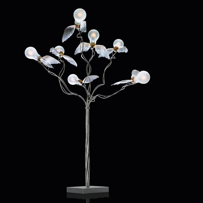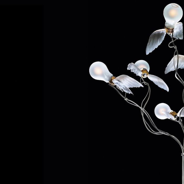 Birdie's busch de Ingo Maurer. Birdie's Busch est une magnifique lampe de table au design superbement poétique. Ces petits oiseaux de lumières sont tout simplement magiques grâce à ces véritables plumes d'oie et l'éclat de ces ampoules. Le corps élégant et torsadé de Birdie's Busch rappelle une branche d'un arbre où ces oiseaux de lumières pourraient voltiger et se poser. Pleine de grâce et de poésie, la lampe Birdie's Busch ne pourra vous laisser indifférent.