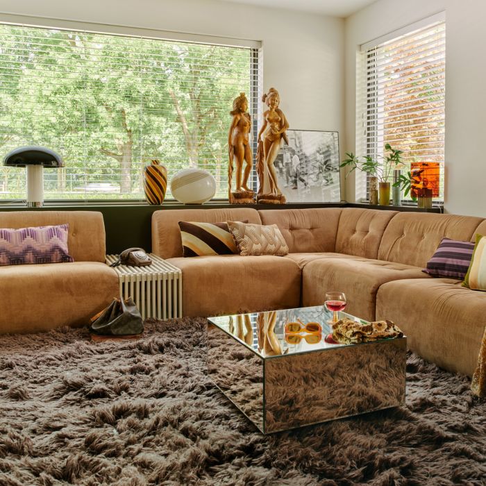 Banc / élément multifonctionnel à lattes de couleur sable. Utilisez-le comme un banc ou ajoutez-le à votre canapé comme un élément supplémentaire et pimentez-le.