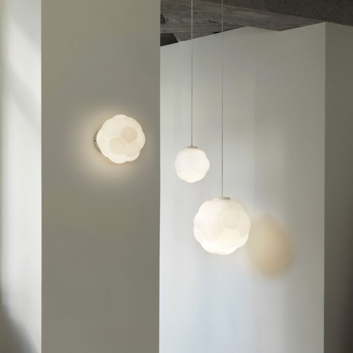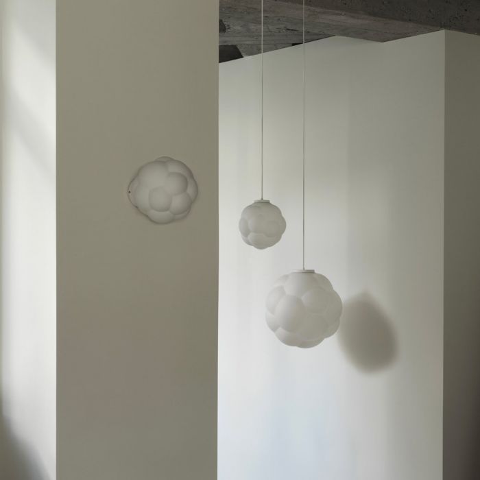 Bubba suspension de Normann Copenhagen par Yuchen Wu. Bubba est une collection de luminaires de caractère inspirés des amas aux multiples facettes formés par des bulles de savon flottantes. La forme inhabituelle élève les abat-jour en verre standard dans un design fascinant, complexe et accrocheur. Conçu pour de nombreuses utilisations et configurations, Bubba possède une esthétique qui s'adapte à n'importe quelle pièce. La collection de lampes est fabriquée à partir de verre opale gravé, un matériau translucide qui assure une lumière agréable et uniforme et émet une lueur chaleureuse. L'abat-jour en verre est composé de bulles de différentes tailles assemblées dans une composition organique asymétrique mais savamment équilibrée. Chaque bulle est unique en taille et en forme, présentant un design qui semble différent de chaque point de vue.