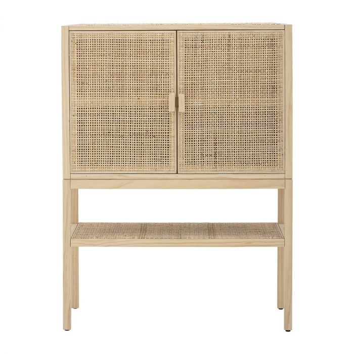 Matériaux : structure en contreplaqué de pin naturel et MDF, cannage de rotin naturel, deux portes avec aménagement intérieur : une étagère avec quatre compartiments